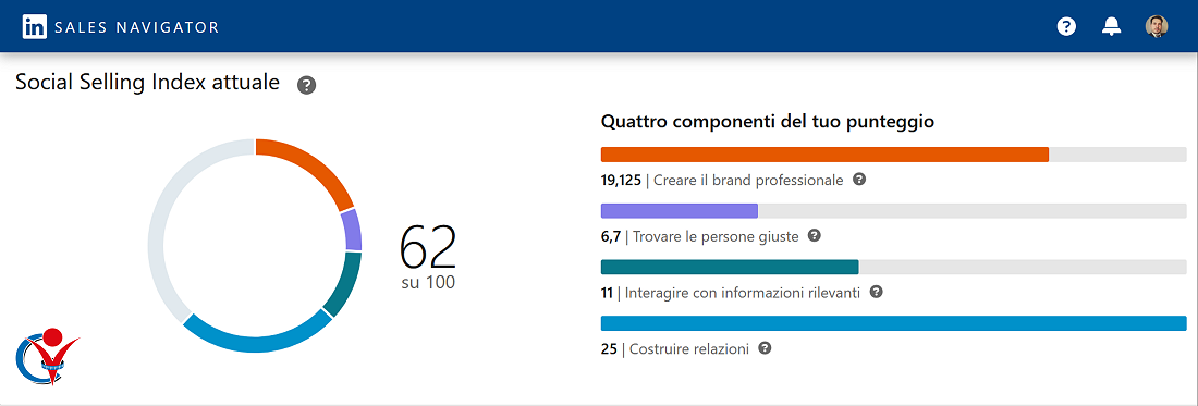 Anche se sei alla ricerca di lavoro e non ti occupi direttamente di vendite, il Social Selling Index (SSI) di LinkedIn è uno strumento prezioso. Pensa ad esso come a un termometro o una bussola che misura l’efficacia delle tue azioni sulla piattaforma in quattro aree chiave, con un punteggio da 1 a 25 per ciuascuna: