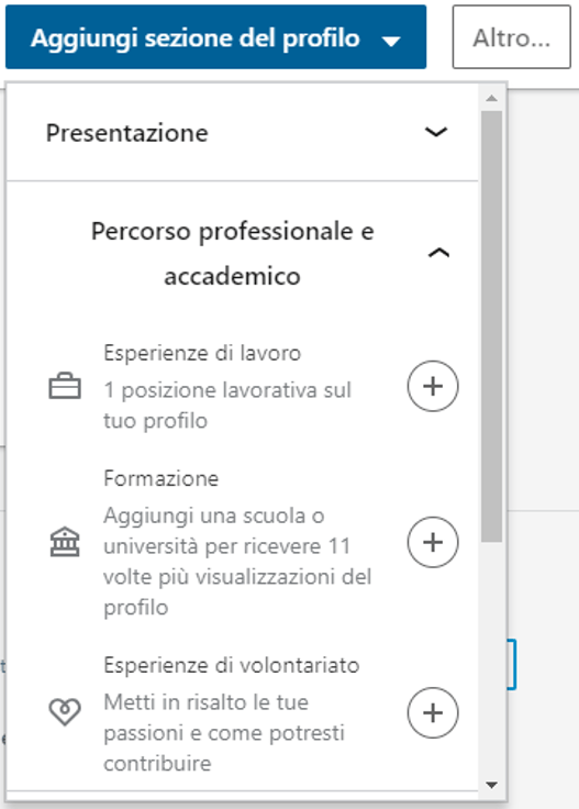 TIP: assicurati di aggiungere tutte le sezioni utili al tuo profilo LinkedIn! Alcune non sono presenti in automatico quando lo crei.