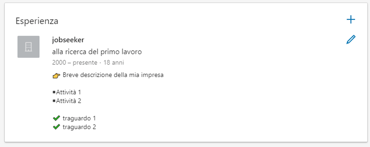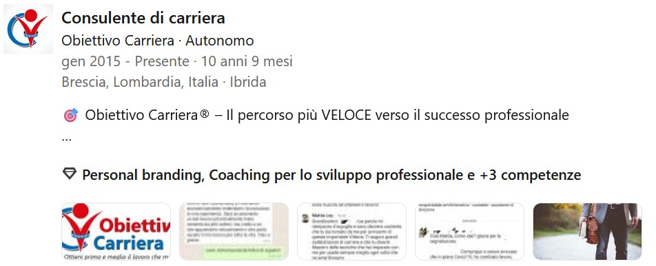Per migliorare la visibilità del tuo profilo su LinkedIn, cerca sempre di scegliere le professioni dai suggerimenti che ti offre la piattaforma. Questo perché gli algoritmi usano questi termini per abbinarti più facilmente alle offerte di lavoro e renderti più reperibile. Ad esempio, se hai sempre svolto il ruolo di “Responsabile di Logistica” ma LinkedIn ti suggerisce “Manager di Logistica”, scegli quest’ultima opzione. Inoltre, per ogni lavoro non descrivere solo cosa facevi, ma anche che impatto hai generato. Usa 3-5 elenchi puntati con verbi d’azione e, dove possibile, numeri.