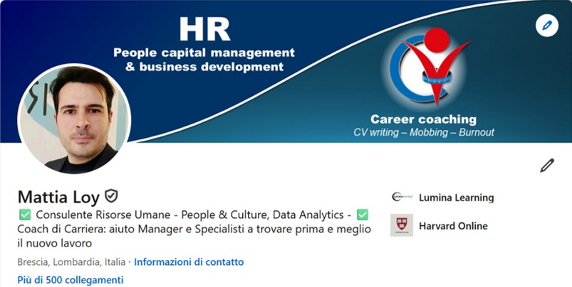 - Banner personalizzato: Questo spazio (con dimensioni ideali di 1584 x 396 pixel) è il tuo cartellone pubblicitario. Usalo per comunicare la tua proposta di valore caricando una immagine (meglio se in formato JPG o PNG) contenente una frase che ti rappresenta o un’immagine legata al tuo settore. Non lasciarlo vuoto o con l’immagine standard. Per le specifiche esatte, puoi consultare la guida ufficiale di LinkedIn sui banner del profilo